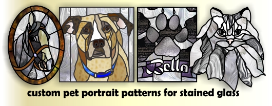 PDQpatterns.com and related sites offer more than 8,000 patterns, for copper foil or lead came stained glass, glass fusing, and glass painting. Interfaith stained glass patterns and cross stitch patterns are at GospelGlass. Additional pet portraits and geometric patterns are found at eStainedGlassPatterns.